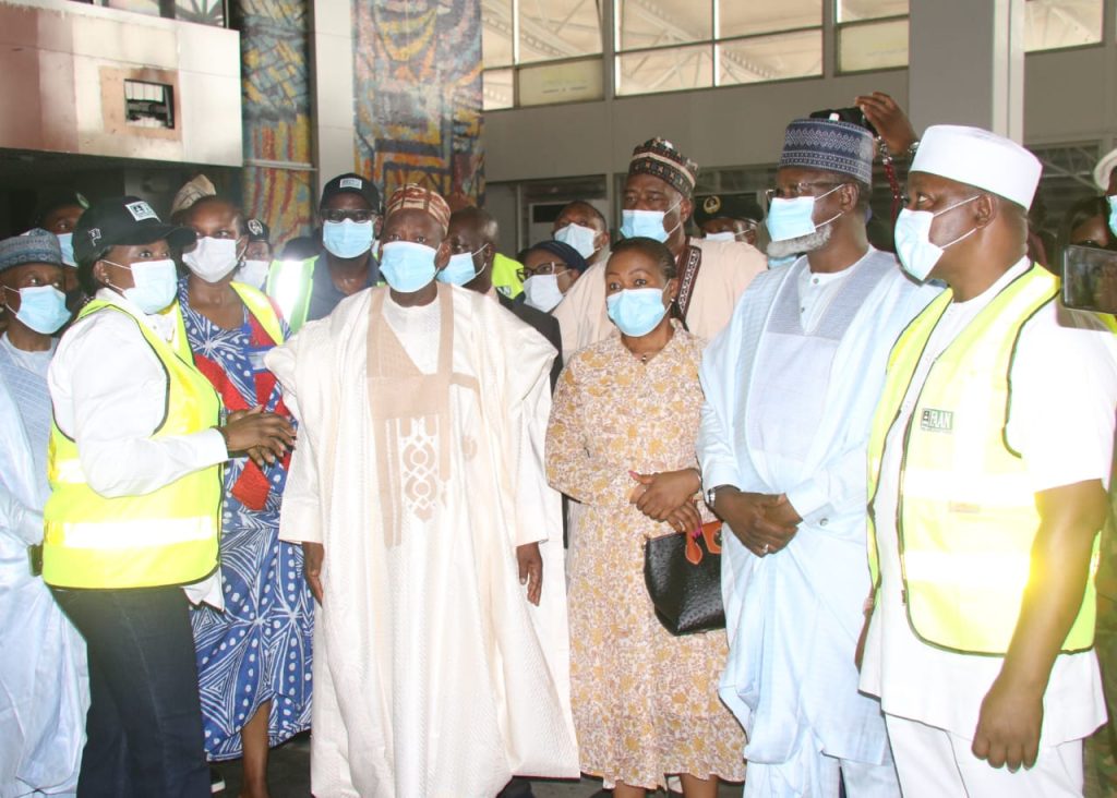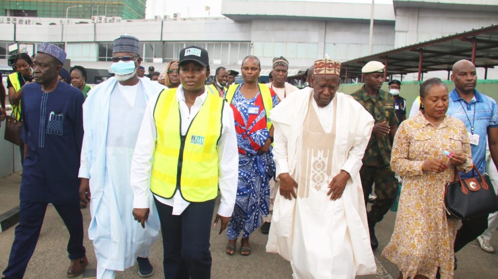 Below Pix 1. From left Mrs Olubunmi Kuku, MD/CE, Federal Airports Authority of Nigeria, FAAN; Mrs Obiageli Ora, Director of Special Duty, FAAN; Dr Abdulahi Umar Ganduje, Chairman, FAAN Board; Dorothy Duruaku, Member, FAAN Board; Ahmad Suleiman, Member, FAAN Board and Captain Abdulahi Mahmoud, Director of Airport Operations during the visit of Dr Ganduje and other members of FAAN board to Murtala Muhammed Terminal 1, Ikeja gutted by fire on Thursday